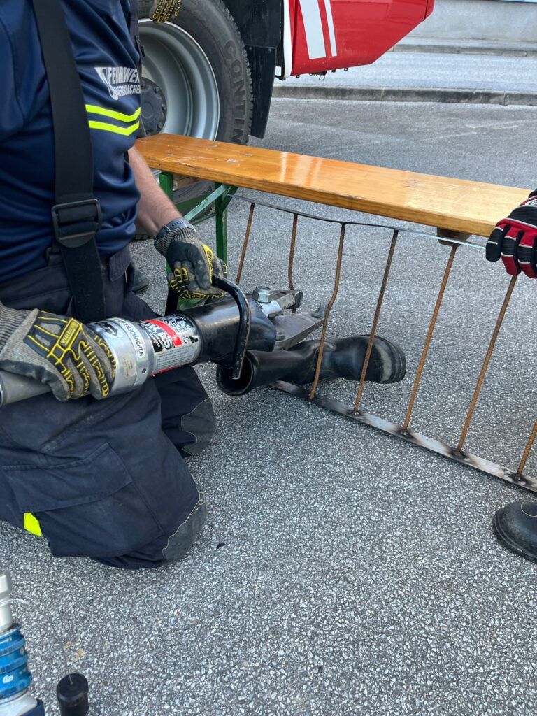 Ein weiteres Szenario war die Rettung einer Person, deren Fuß auf einem Dachstuhl angenagelt war. 👷🏻♂️🏗️Hier war Fingerspitzengefühl gefragt. Unsere Feuerwehrmitglieder verwendeten unterschiedliche Schneidwerkzeuge🪚🧑🚒, um eine rasche und vibrationsarme Rettung zu gewährleisten. Hierbei wurden auch die richtigen Schnitttechniken mit der Säbelsäge und Kettensäge geübt.